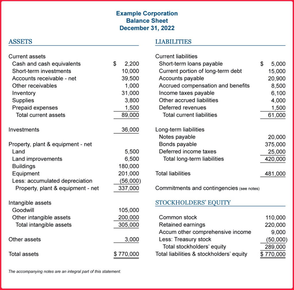 A balance sheet is a financial statement that provides a snapshot of a company’s financial position at a specific point in time. The balance sheet presents the assets, liabilities, and equity of the company and shows how these three components are related to each other. Here is a detailed explanation of each component of a balance sheet: