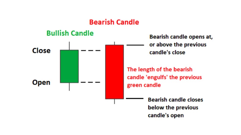 Formation: The pattern consists of two candles – the first candle is green (bullish), followed by a second red (bearish) candle. The second candle should completely engulf or cover the real body of the first candle, including the shadows. This means that the second candle should open above the previous candle’s high, and close below the previous candle’s low.