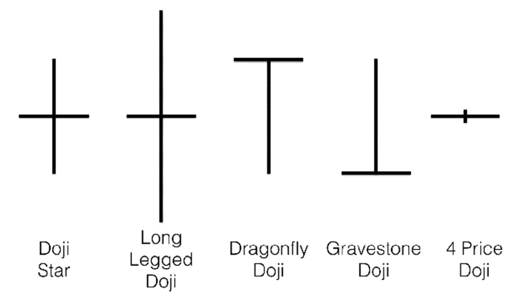 There are four main types of Doji candlestick patterns:
