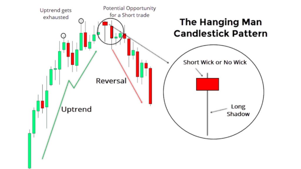 The “Hanging Man” is a candlestick pattern used in technical analysis to help identify potential reversals in an asset’s price movement. It is a single candlestick pattern that is formed when the price opens high, trades lower throughout the day, and then closes near its opening price.