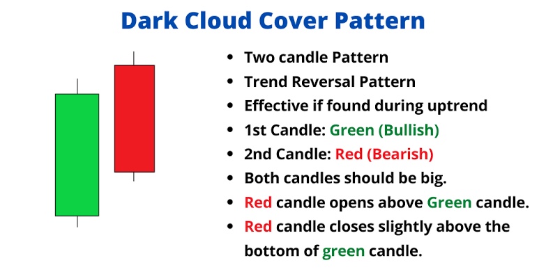 The “Dark Cloud Cover” is a bearish candlestick pattern that typically forms at the end of an uptrend. It is a two-candlestick pattern that can provide traders with a warning signal that the uptrend may be reversing.
