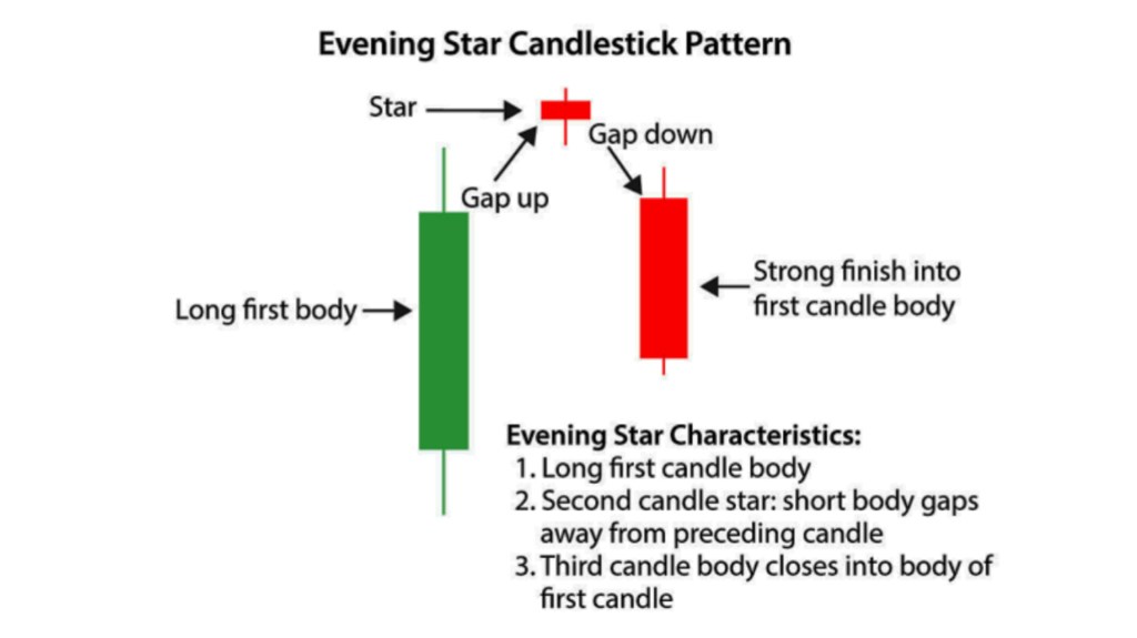 The “Evening Star” is a popular bearish reversal candlestick pattern that appears on a price chart after a prolonged uptrend. The pattern consists of three candles and is formed by the following sequence of candles: