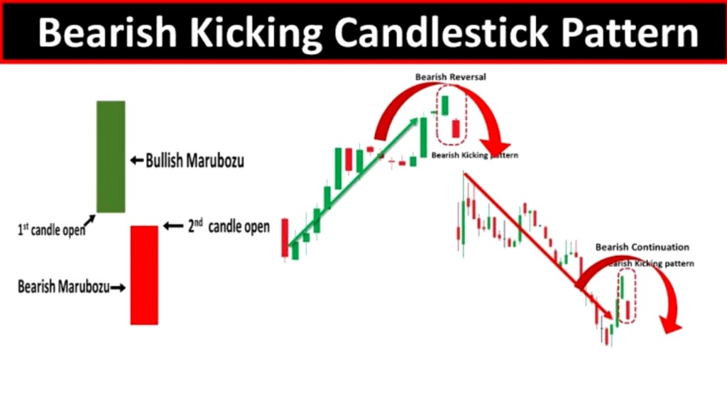 The “Bearish Kicking” candlestick pattern is a two-candlestick reversal pattern that occurs at the end of an uptrend. This pattern suggests that the bullish trend has come to an end and a new downtrend is likely to begin.