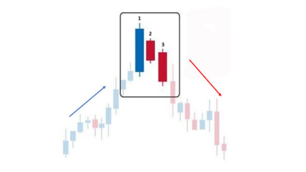 3) The third candle is a large bearish candle that engulfs the previous two candles and closes below the low of the first candle, confirming the trend reversal.