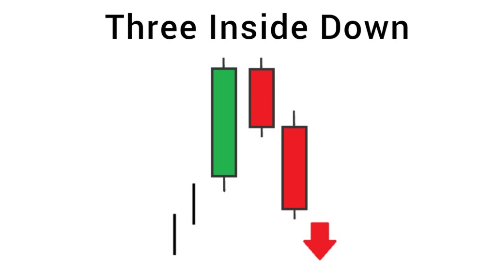 The “Three Inside Down” candlestick pattern is a bearish reversal pattern that occurs after an uptrend. It is made up of three candles, with the first two candles being relatively small and the third candle being a long bearish candle that closes below the first candle’s low.