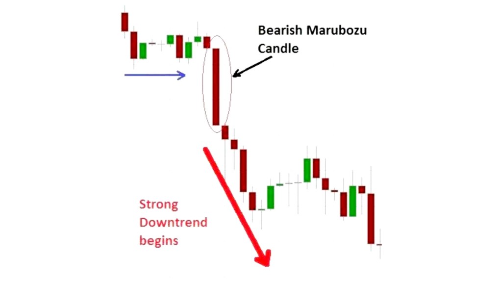 2) Long candle body: The body of the Bearish Marubozu is long and filled or colored black or red, which indicates that the closing price is lower than the opening price.