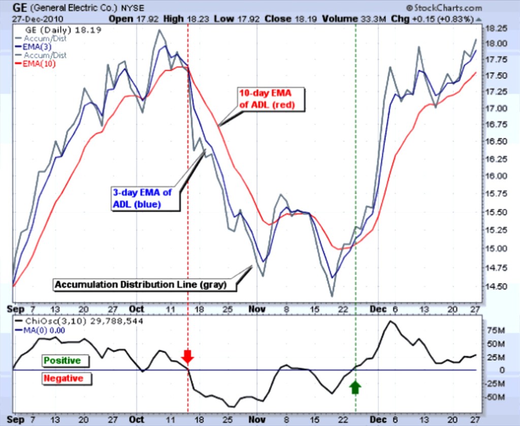 The Chaikin Oscillator is calculated by subtracting a 10-period exponential moving average (EMA) of the ADL from a 3-period EMA of the ADL. The ADL is calculated by taking the sum of the volume for each period multiplied by the difference between the closing price and the midpoint of the high and low price for that period. The result is added to the previous ADL value to create a cumulative total.