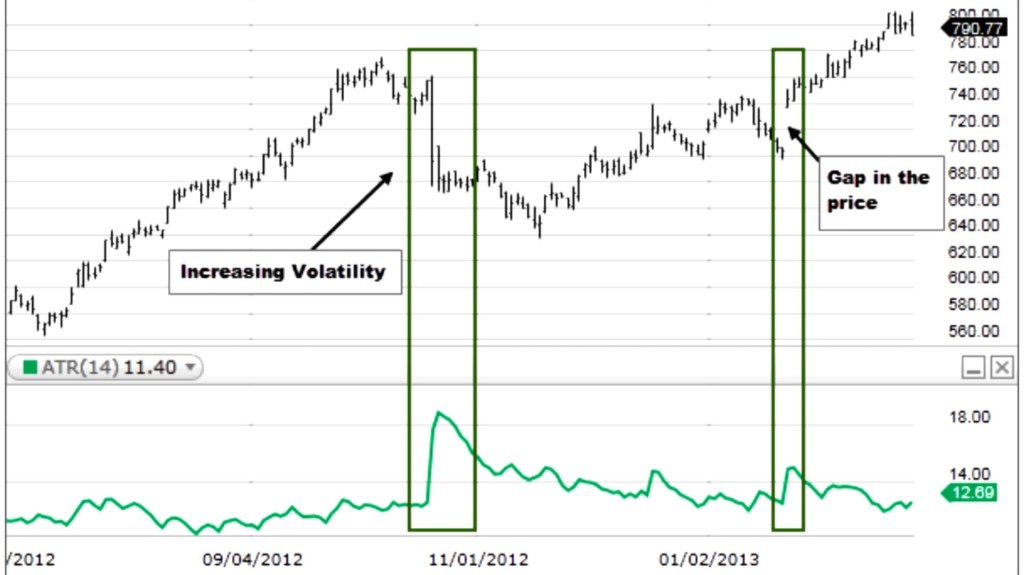 The ATR indicator is plotted as a line on the chart, with higher values indicating higher volatility and lower values indicating lower volatility.